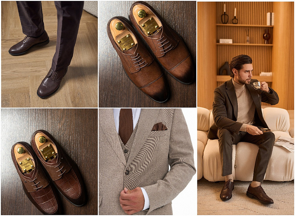 Коричневая кожа традиционно считается наиболее универсальной и удобной для ежедневного использования. Коричневые дерби можно сочетать с множеством вещей: от джинс и чиносов до костюмных брюк. Наиболее распространённые комбинации включают светло-коричневую кожу с серыми или голубыми брюками, а также темно-коричневую обувь с темными брюками.
