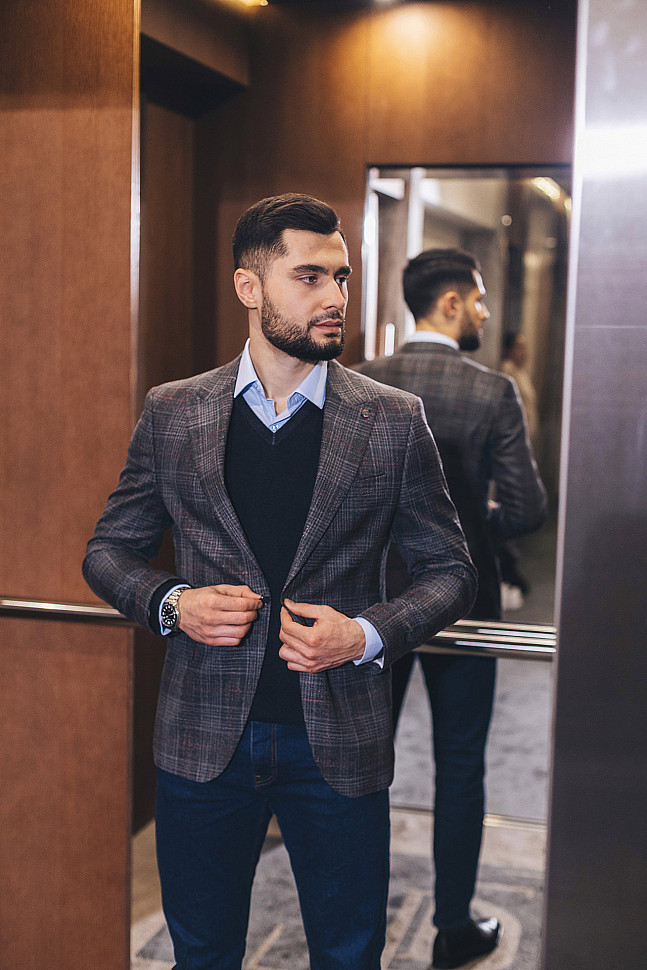 Например, создать деловой casual образ можно с помощью пиджака, рубашки, кардигана.
