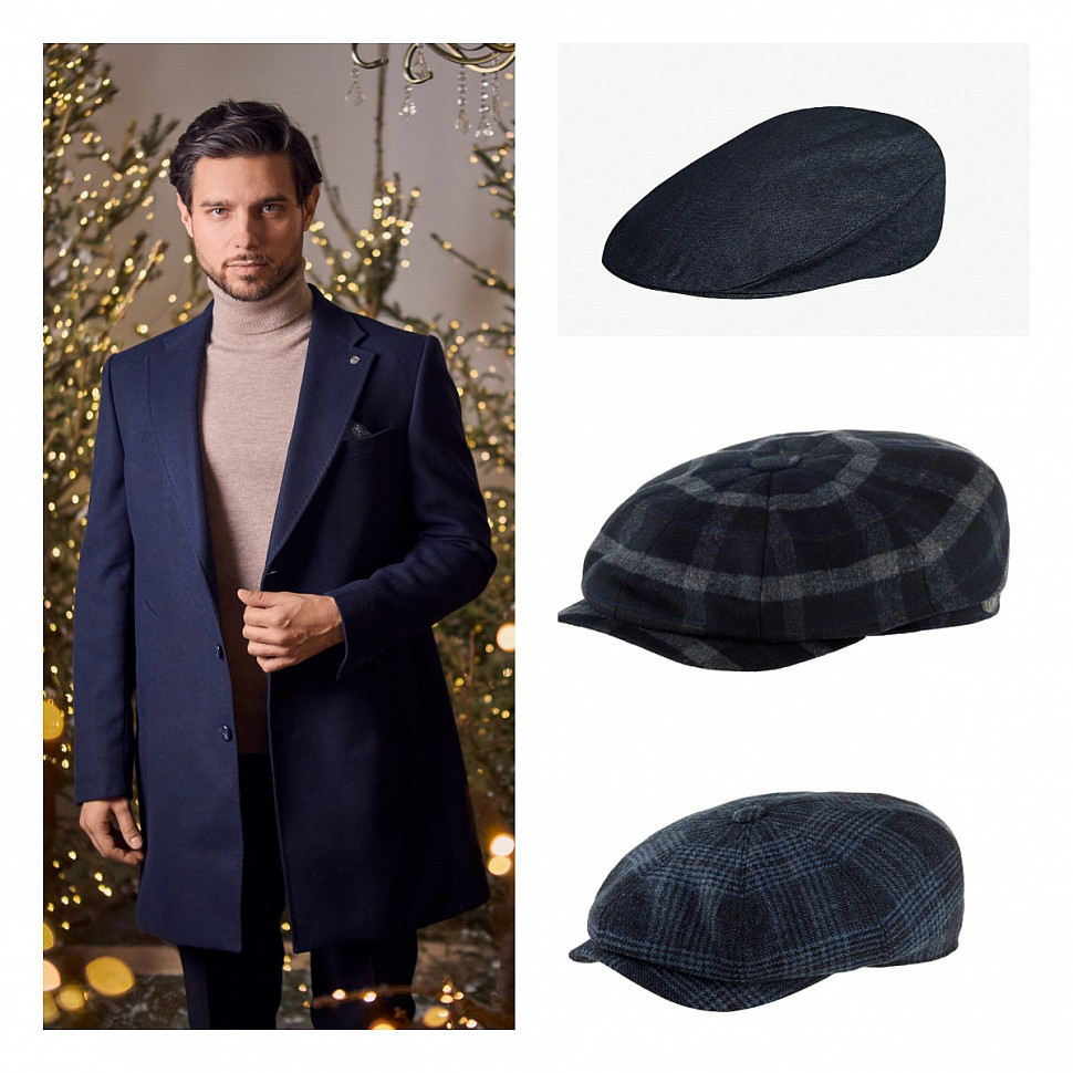 При выборе головного убора к мужскому пальто, отталкивайтесь от цвета и фактуры изделия. В данном случае, к синему пальто мы подобрали классическую плоскую кепку в темно-сером цвете. Завершит и сделает образ более гармоничным, шарф в тон головному убору.